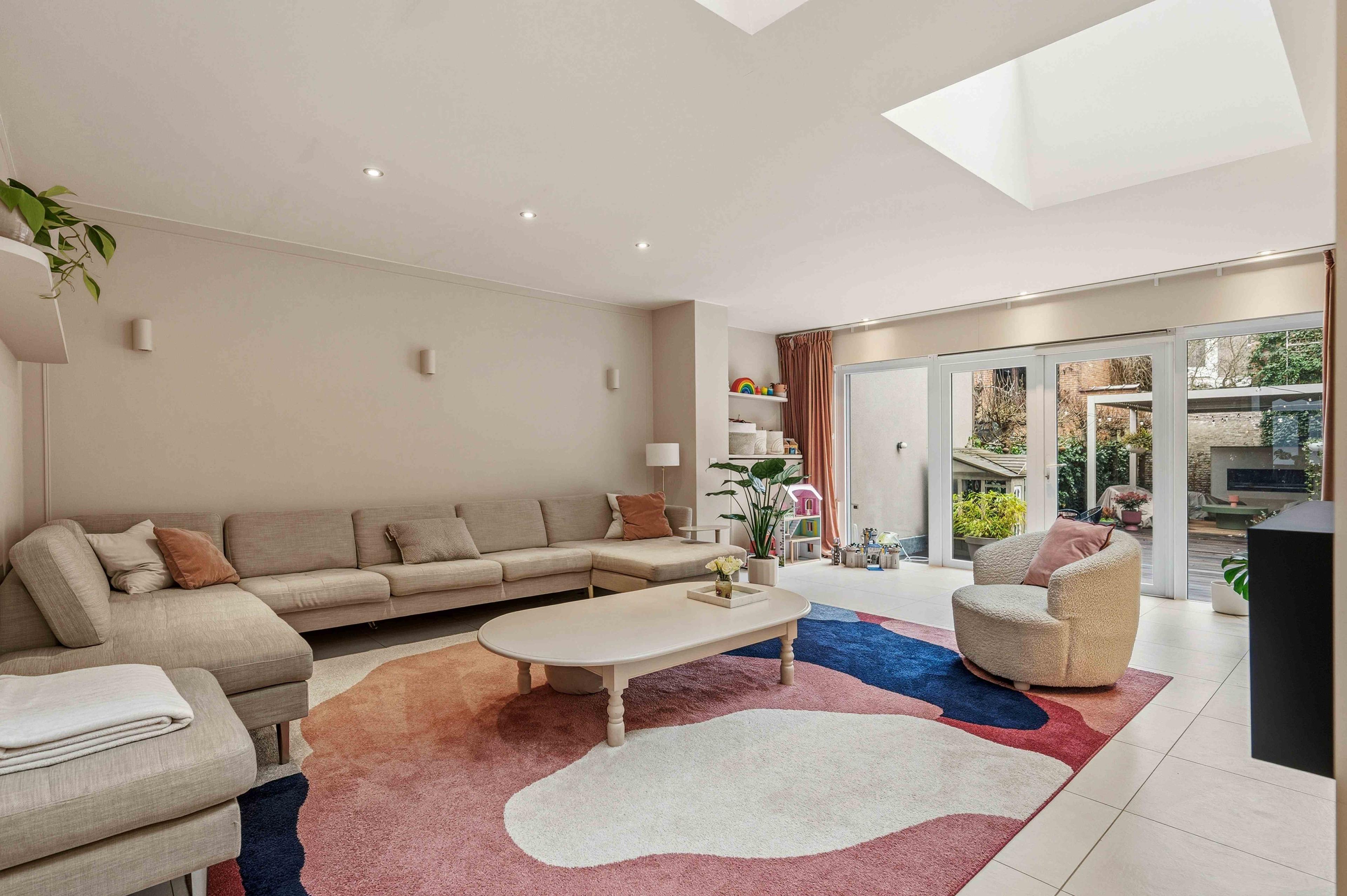 U betreedt de woning via een indrukwekkende inkomhal met hoge plafonds en een volledige wand aan ingemaakte kasten, uiterst praktisch voor jassen en schoenen. De gelijkvloerse leefruimte is harmonieus ingedeeld met vooraan een ruime open keuken met kookeiland en kwalitatieve toestellen, aansluitend een gezellige eetruimte en achteraan een comfortabele zit- en speelruimte. Dankzij lichtkoepels, een bio-ethanol haard en warme materialen straalt deze verdieping rust en gezelligheid uit. De volledige gelijkvloers (en alle badkamers) zijn voorzien van vloerverwarming, wat zorgt voor een strak en esthetisch geheel zonder radiatoren.